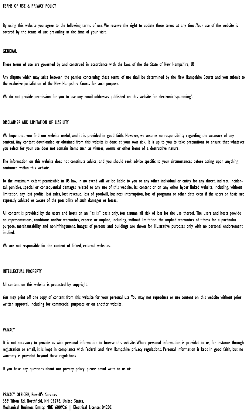 "Friendly As Can Be Since 1983!" When you need help with your plumbing, drains, heating, cooling or electrical in Gilford, you can always rely on Rowell's Services! Call us now or book online!
